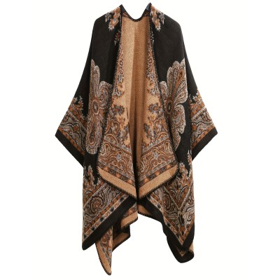 Plus Size Ethnic Pattern Shawl Top, Vintage Warm Open Front Cover Up Top For Winter & Fall, Women's Plus Size Clothing